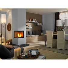 Широкая топка классического дизайна станет достойным украшением большой по площади комнаты. Эффектная модель может работать и на дровах (желательно выбирать тщательно просушенные), и на топливных брикетах.