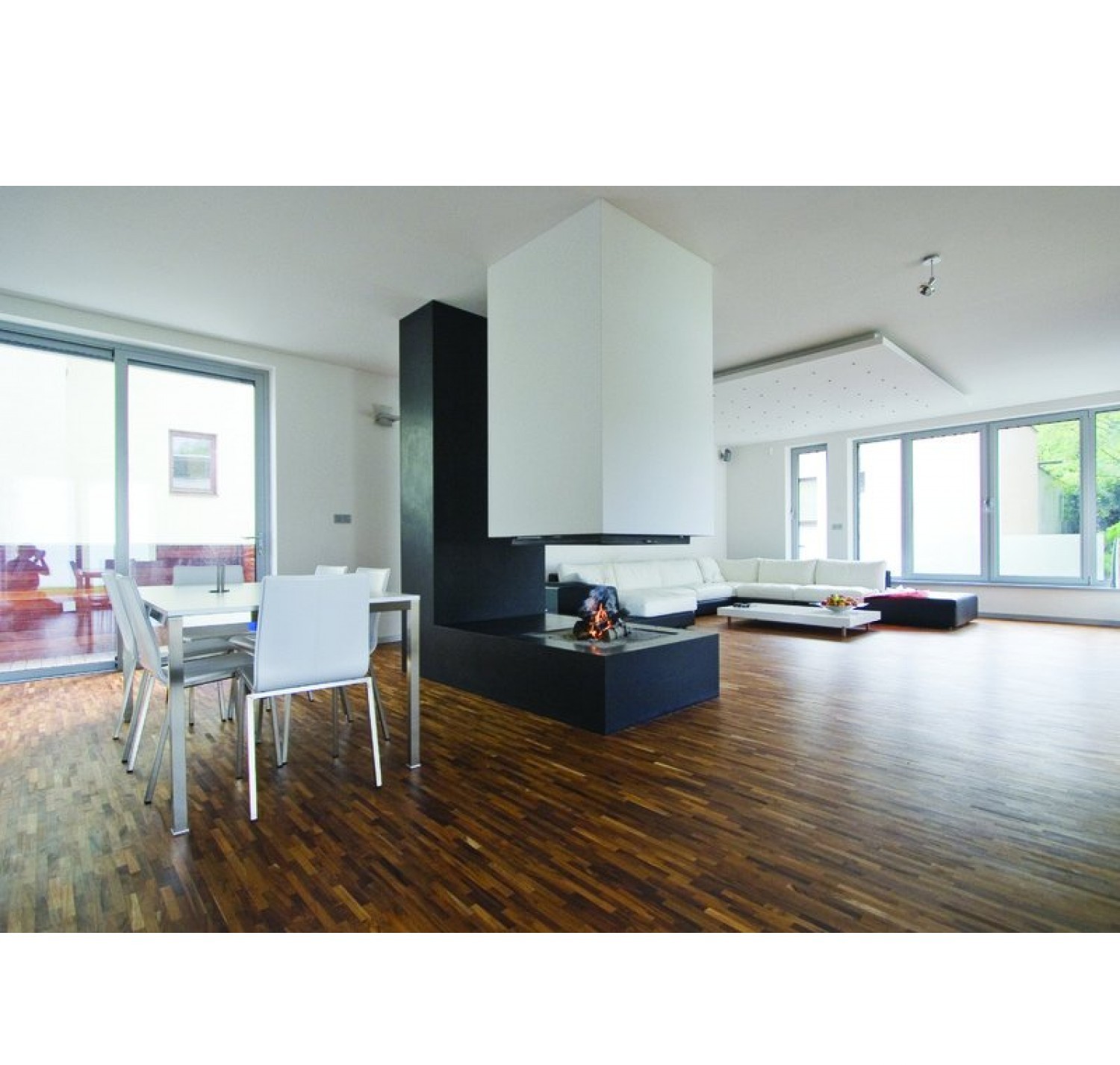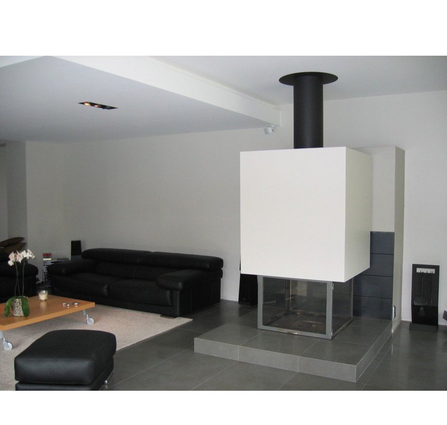 Топка предназначена для установки только в центре комнаты, оснащена подъемным механизмом, с помощью него все четыре стекла поднимаются вверх. Две противоположных стекла открываются вбок для удобства чистки камина. Корпус топки выполнен из легированной стали. Для установки топки необходимо дополнительно заказывать систему подвешивания. В зависимости от ситуации установки необходимо выбрать подходящий вариант подвешивания топки исходя из высоты помещения и верхней фиксации крепления. Очаговая зона основания выложена высокопрочным огнеупорным кирпичом.