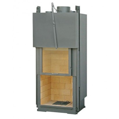 Дровяная каминная топка с прямым стеклом изготовлена из высококачественной стали, внутренняя часть которой футерована шамотом. Топка оснащена системой очистки стекла, встроенным шибером и системой подводки внешнего воздуха в камеру сгорания, а также оборудована цепным механизмом подъема двери, съемной колосниковой решеткой и ножками, которые дадут возможность установить топку на неровной поверхности.