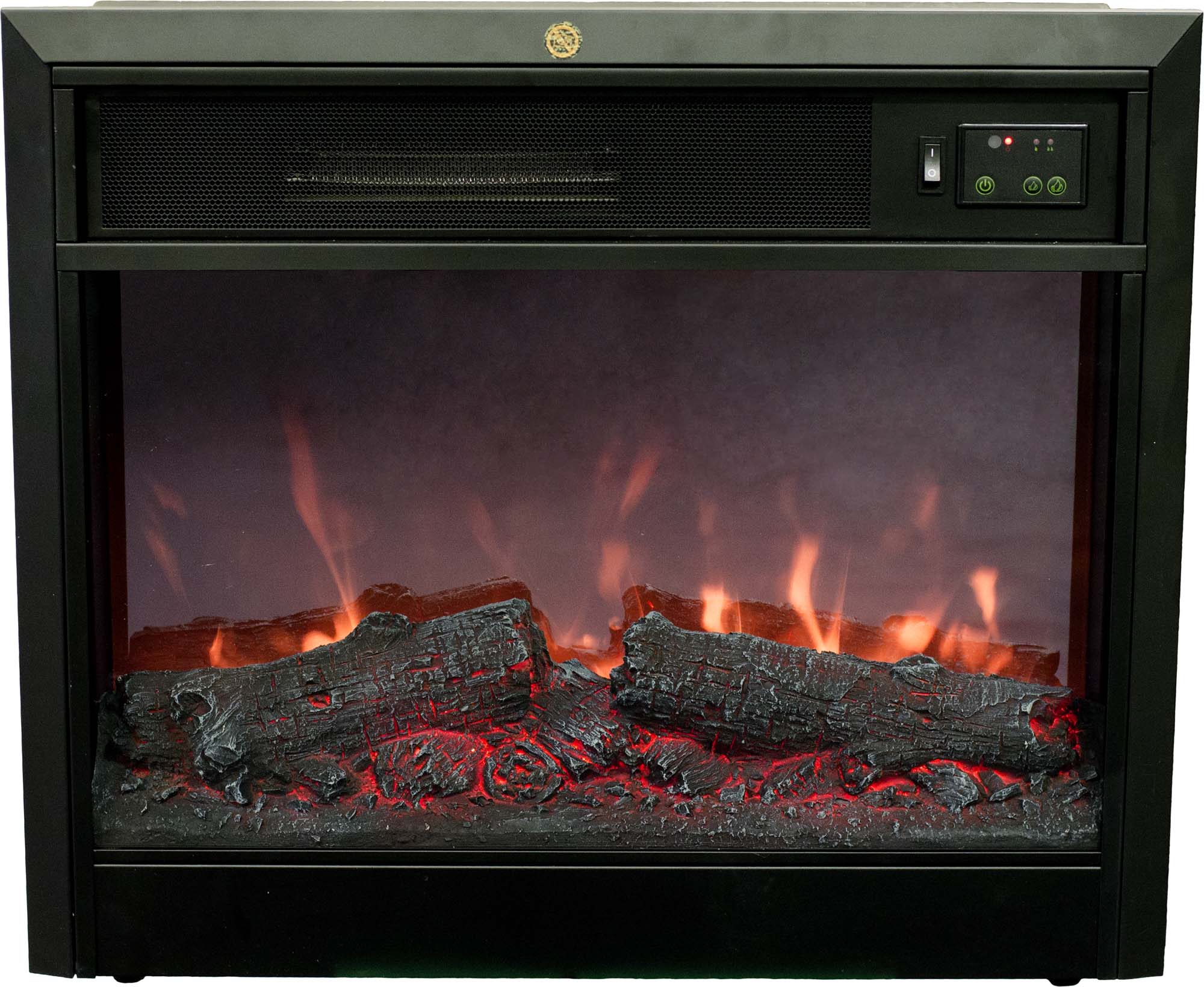 - В электрокамин встроен электрообогреватель, работающий в двух режимах обогрева и в декоративном режиме - только имитация пламени и горящих дров. Управление всеми функциями электрокамина, осуществляется с пульта д/у.