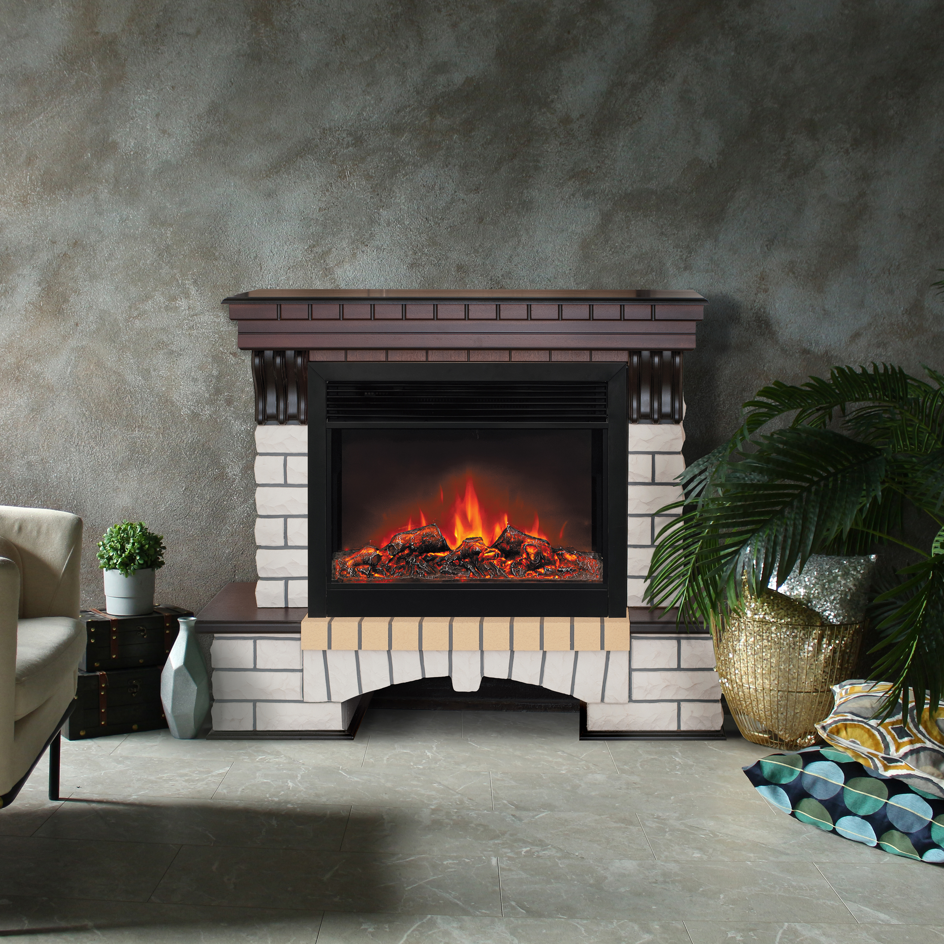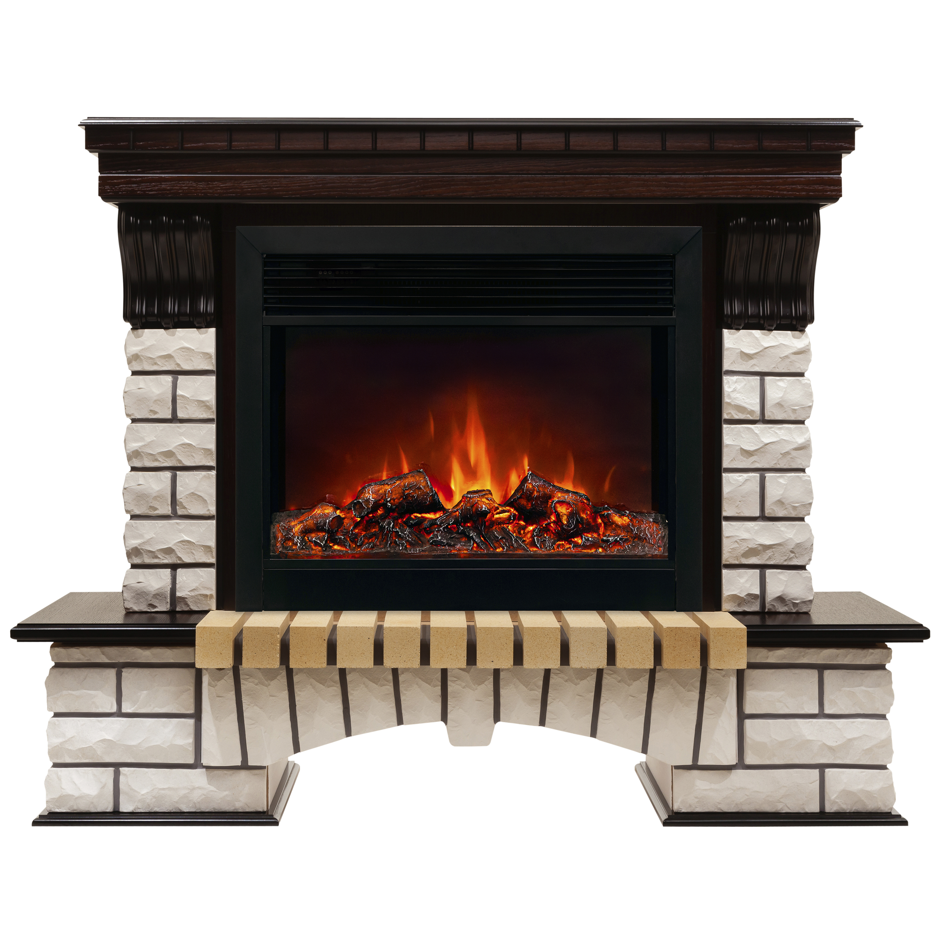- Изготовлен из искусственного камня и МДФ, покрытого шпоном, - прочного, надежного и стойкого к любым внешним воздействиям материала. Сочетание светлого камня и темного дерева, декоративная фрезеровка. Дизайн дополнен выемкой для хранения дров в основании обрамления. С массивной каминной полкой.