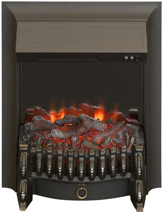 - Качественный очаг стандартной компоновки, изготовленный из стали. Яркая имитация горения. Витая решетка на передней части.