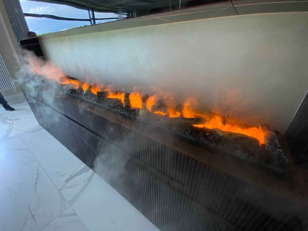В первую очередь стоит отметить абсолютную безопасность этой модели. В качестве топлива выступает чистая вода, что обеспечивает абсолютную экологичность изделия. Формирование пламени происходит за счет работы ультразвуковых испарителей. Они формируют паровую завесу, которая распределяется по всей линии огня, а затем подсвечивается LED-лампами. Пар попадает непосредственно в помещение, способствуя дополнительному увлажнению воздуха в нем. Поэтому в каминной создаются комфортные для отдыха условия микроклимата.